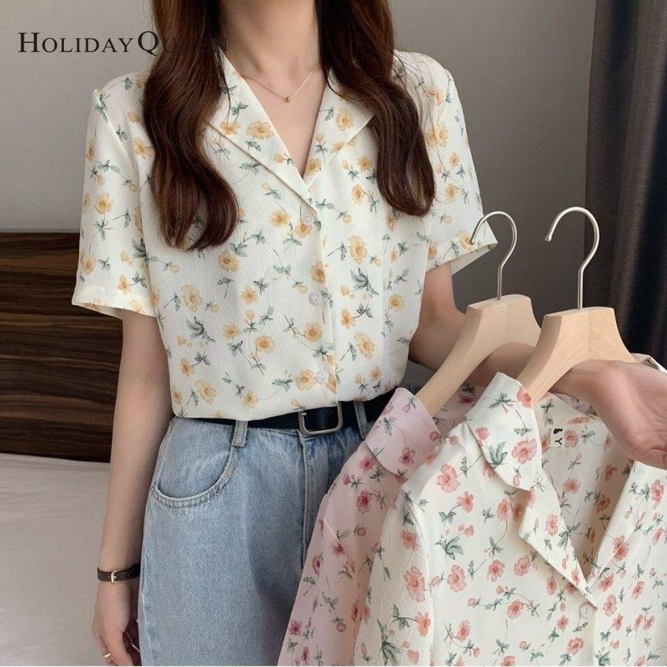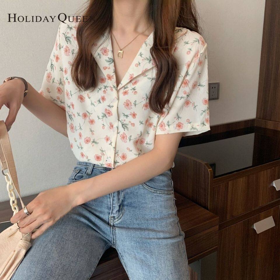 HolidayQueen Top Women's New Loose Small Fresh Floral Shirt Retro Wild Shirt Short-sleeved Design Niche HQP0900