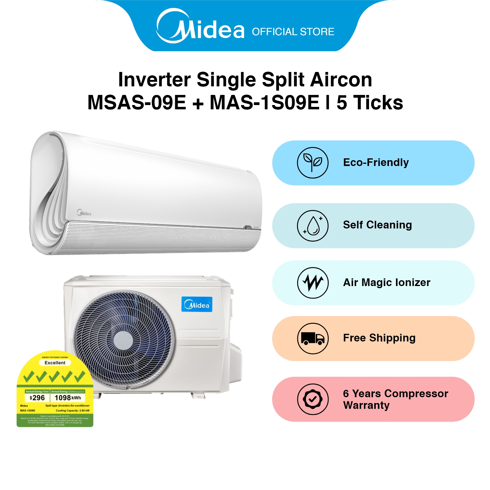 [Bulky] Midea MSAS-09E + MAS-1S09E Single Split Aircon, [System 1] 9000 BTU, Energy Rating 5 Ticks