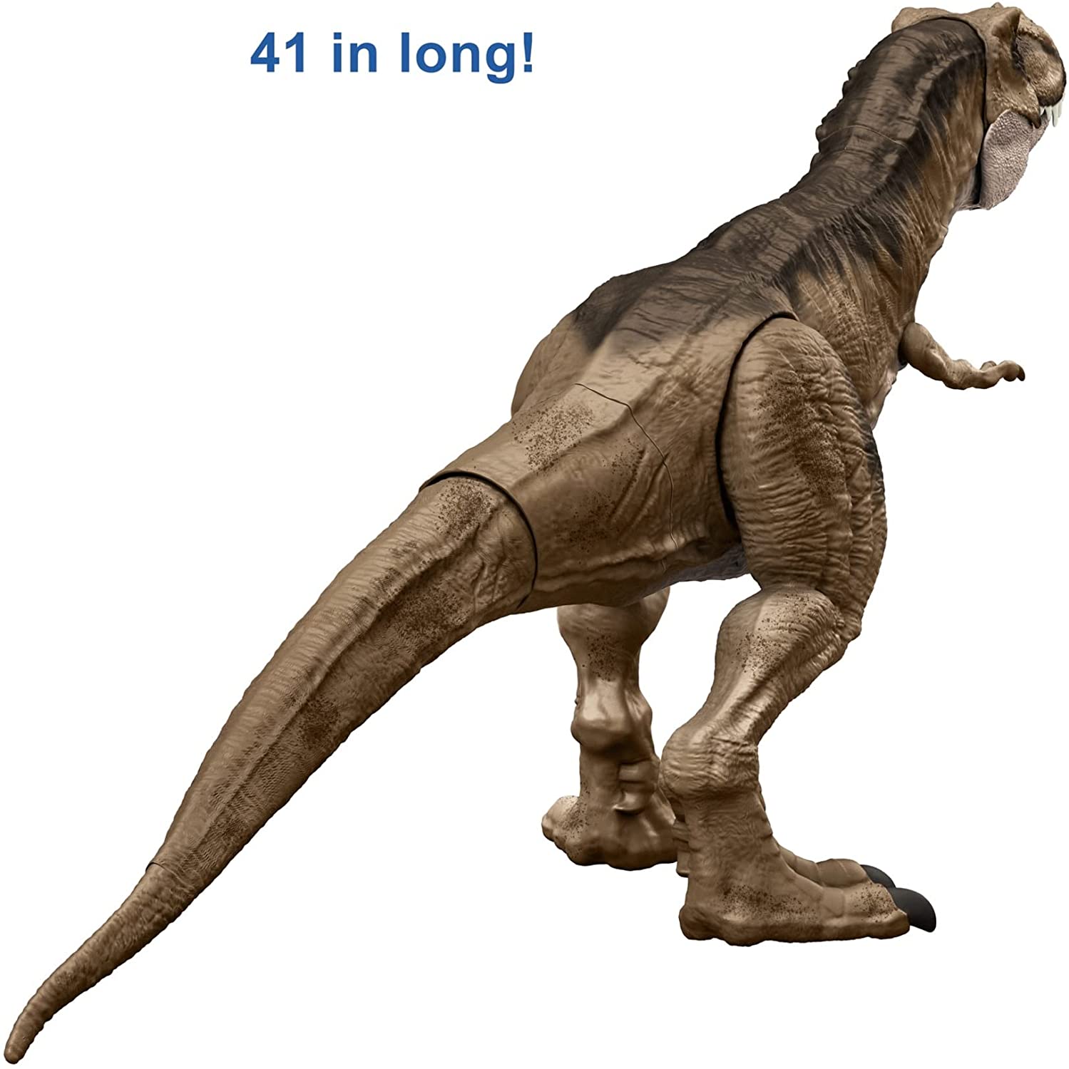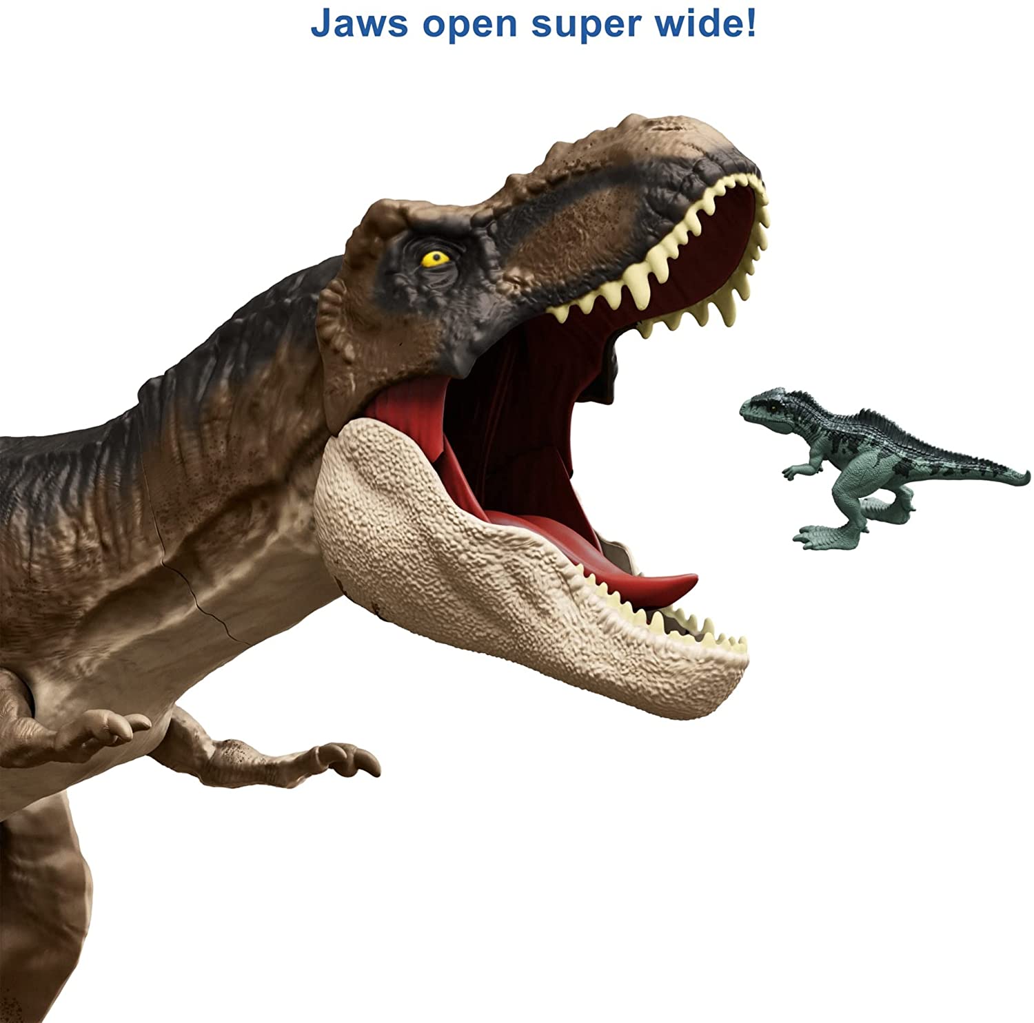 Discover exciting action and adventure with this Super Colossal Tyrannosaurus Rex dinosaur action figure inspired by Jurassic World: Dominion! This T rex comes in a huge size, over 3 feet long. The fun really gets big when kids open their jaws, because this figure can swallow mini figures whole. Pull mini figs out of an existing collection and let the T. rex squash them, then undo the latch on the belly to release them and start a new carnivorous story. It also features authentic sculpting, texture, and color. Makes a great gift for ages 4 and up, especially fans of Jurassic World, dinosaurs, and action games.