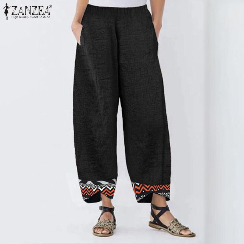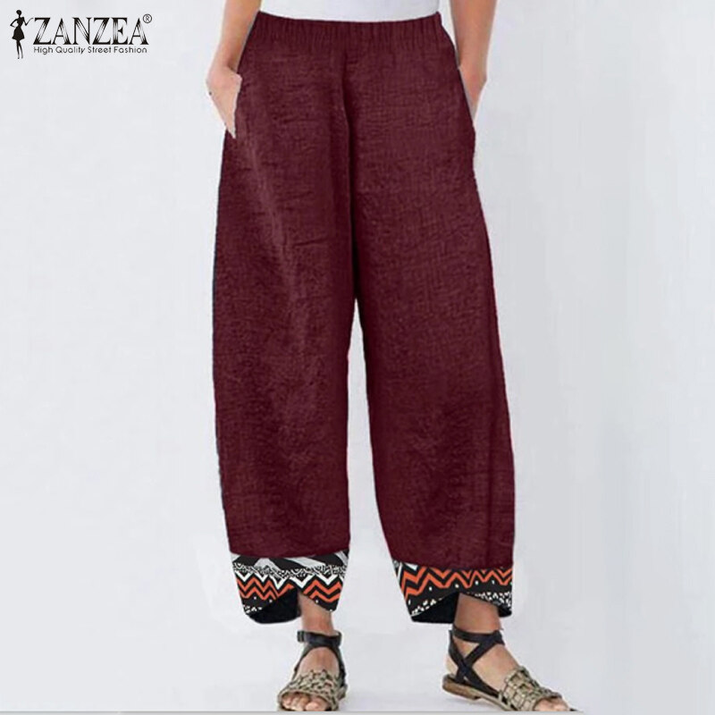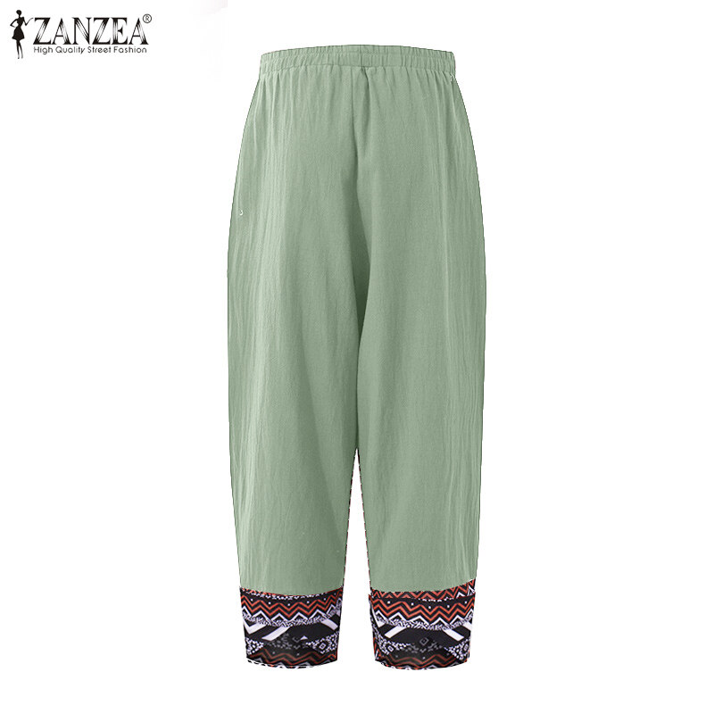[Clearance Sale]ZANZEA Clearance Sale Womens Summer Elastic Waist Casual Pants Printed Hem Wide Leg Trousers CLE