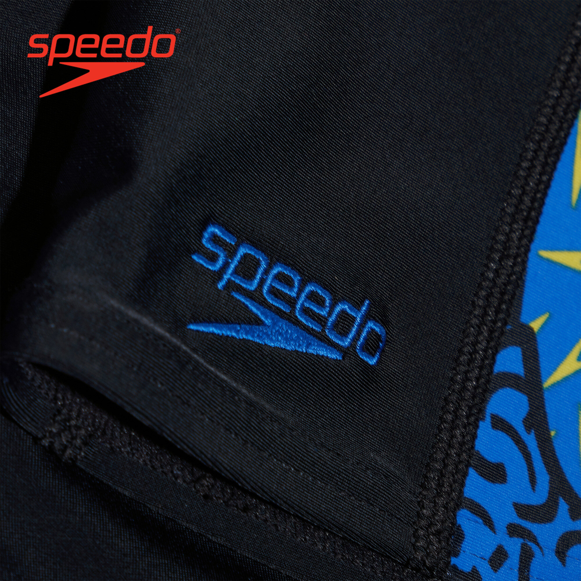 Style and comfort for lessons and training. Ooze confidence wearing this sleek black Jammer, which features side panels of our high-energy abstract print in bright yellow, green and blue. Lined at the front for comfort and modesty, the jammer includes an internal drawcord to allow your child to achieve a secure and comfortable fit. Providing higher chlorine resistance than standard swimwear fabrics, it offers excellent shape retention and fits like new for longer with CREORA® HighClo. If you’re looking for great eco-credentials, it’s got those, too: our exclusive Eco EnduraFlex fabric is made from 100% recycled pre-consumer waste, such as fabric waste from factories.