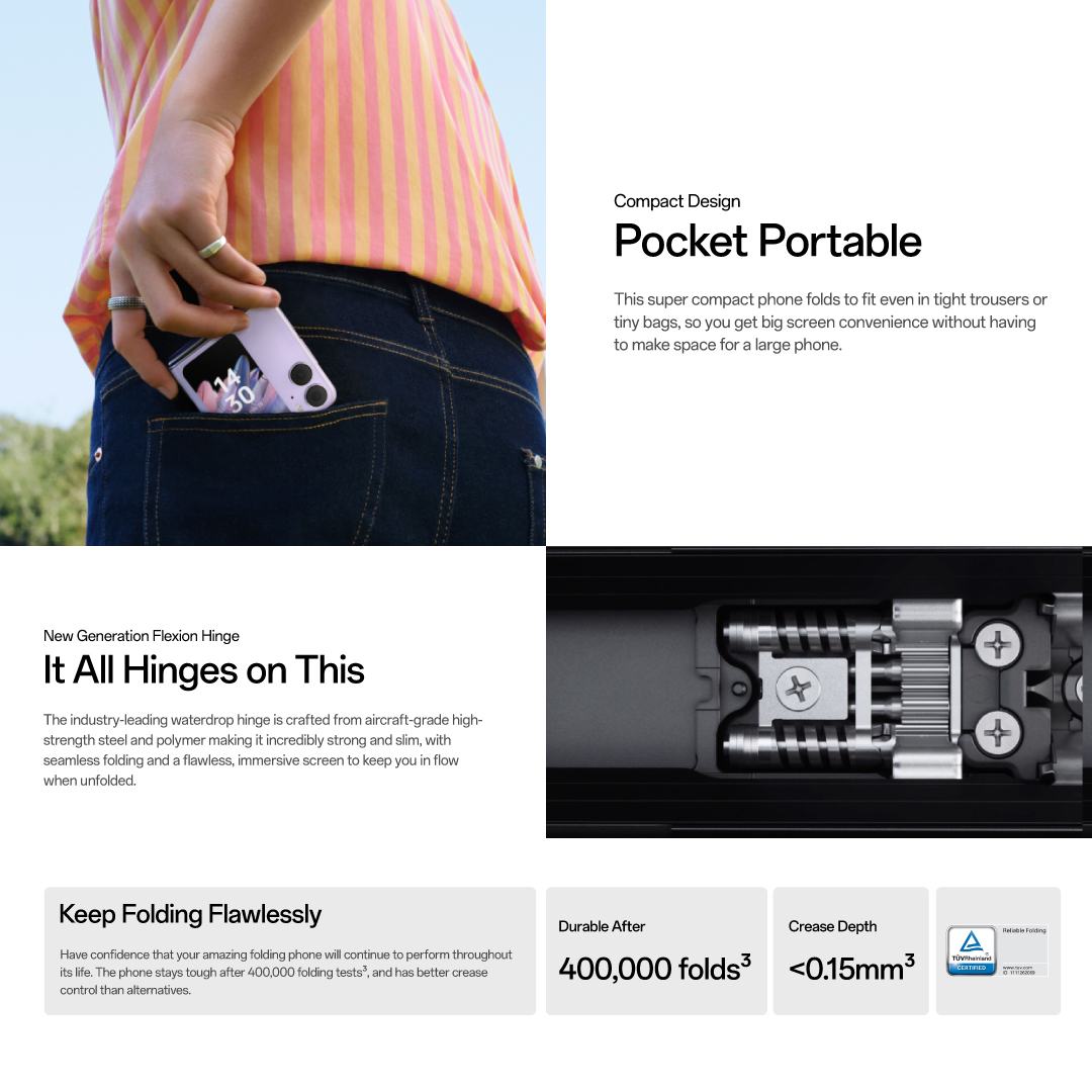 Discover the tech-savvy, style statement phone that lets you see more in a snap. The larger cover screen expands your view with innovative features, whilst the foldable design reimagines photography possibilities, all in a gorgeous and flawless design that you can pop in your pocket.